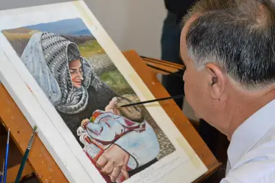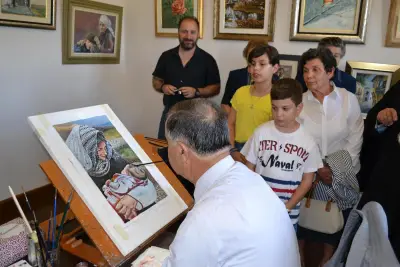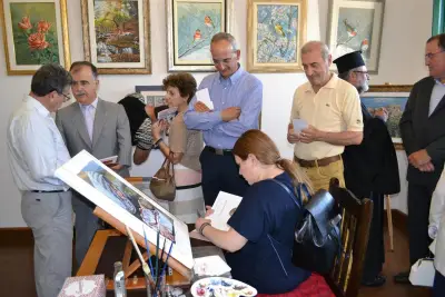 Ἐν συνεχείᾳ ὁ κ. Τριανταφυλλος Ἠλιάδης ἔκανε ἐπίδειξη τοῦ τρόπου πού ζωγραφίζει ἐνώπιον τῶν ἐπισκεπτῶν τῆς ἐκθέσεως, δέχθηκε τά συγχαρητήριά τους καί ἀπάντησε σέ ἐρωτήσεις.