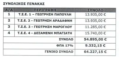 Στον πίνακα φαίνεται το κόστος εγκατάστασης αναλυτικά και για τα 4 τμήματα συστήματος ελέγχου (Τ.Σ.Ε.) καθώς και το συνολικό κόστος για να γνωρίζουν οι δημότες που διατίθενται τα χρήματά τους.