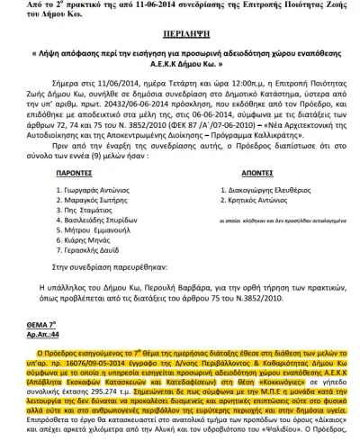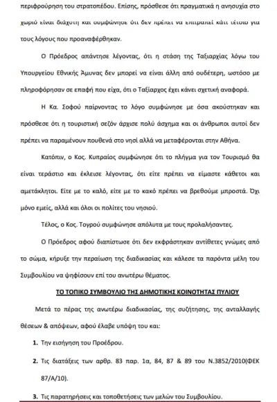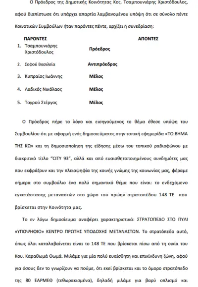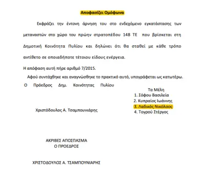 α) απόφαση στου κοινοτικού μας συμβουλίου στην οποία φαίνεται ξεκάθαρα το Όχι της παράταξής μας για εγκατάσταση κέντρου μεταναστών στο Πυλί.
