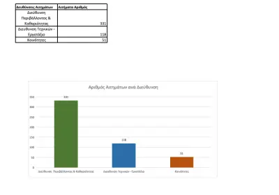 Τα περισσότερα αιτήματα, 331 συνολικά, σχετίζονται με τη Διεύθυνση Περιβάλλοντος και Καθαριότητας, ακολουθούν 118 αιτήματα που αφορούν στις αρμοδιότητες της Διεύθυνσης Τεχνικών Υπηρεσιών και του Εργοταξίου ενώ κατατέθηκαν και 51 αιτήματα στις Δημοτικές Κοινότητες.
