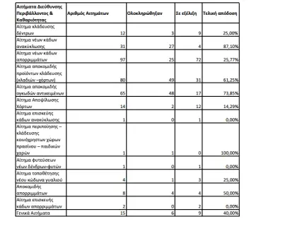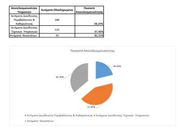Αντίθετα, απαιτείται βελτίωση του δείκτη αποτελεσματικότητας της Διεύθυνσης Περιβάλλοντος και Καθαριότητας, έστω και αν δέχεται το μεγαλύτερο όγκο αιτημάτων, αφού από τα 331 αιτήματα διεκπεραιώθηκαν τα 160 (ποσοστό 48,3%). Τα περισσότερα αιτήματα που εκκρεμούν στο συγκεκριμένο τομέα επικεντρώνονται στην τοποθέτηση νέων κάδων απορριμμάτων, κάτι που λαμβάνει σοβαρά υπόψιν της η δημοτική αρχή. Ο Αντιδήμαρχος κ. Μουζουράκης έχοντας τα συγκεκριμένα στοιχεία, αναμένεται το επόμενο διάστημα να καλύψει το συγκεκριμένο κενό.