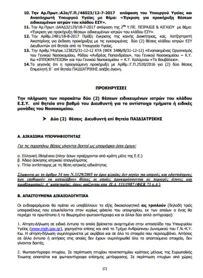 Δύο (2) θέσεις Διευθυντών Παιδιατρικής
