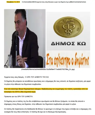 Στις 13 Νοεμβρίου του 2014 είχε εξαγγείλει την ώρα του δημότη που θα λάμβανε χώρα μια φορά τον μήνα αρχής γενομένης από τον Ιανουάριο του 2015! (Σας ξαναθυμίζουμε το σχετικό δελτίο τύπου). Δελτίο τύπου τότε. Συνέντευξη τύπου σήμερα.