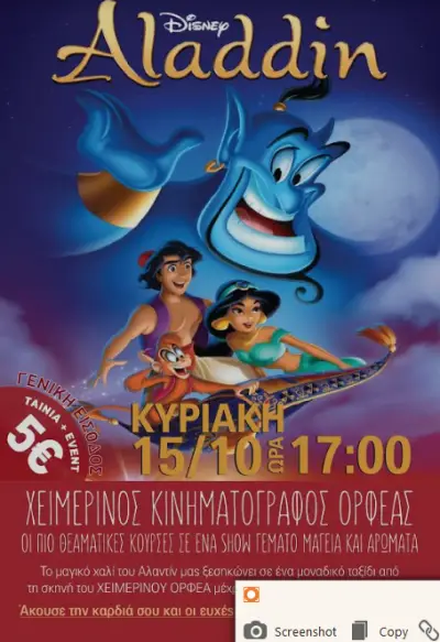 «Αλαντίν»(Ταινία, Θεατρικό Παιχνίδι) Η πιο γρήγορη κούρσα με χαλί θα γίνει για πρώτη φορά στη σκηνή του Χειμερινού Ορφέα! Η Γιασμίν, ο Αλαντίν, το Τζίνι και ο Τζαφάρ προσγειώνονται με το μαγικό χαλί τους σε αυτό το φιλόξενο χώρο που θα είναι γεμάτος αρώματα, εκπλήξεις και στοιχεία από την μαγευτική Σαουδική Αραβία… Μην το χάσετε! Άκουσε την καρδιά σου και οι ευχές σου θα γίνουν πραγματικότητα! Ταινία + Event 5 €