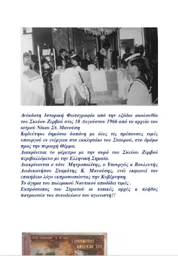 Εκπροσωπώντας την Κυβέρνηση απηύθυνε χαιρετισμό ο Υφ. Ναυτιλίας και βουλευτής Δωδ/σου κος Νεκτάριος Σαντορινιός, χαρακτηρίζοντας τον Σκεύο Ζερβό ως παγκόσμια προσωπικότητα και μεγάλο πατριώτη, με την ακάματη εργασία του οποίου ήρθαν στο φως και αξιοποιήθηκαν πόροι από τα Εθνικά κληροδοτήματα.
