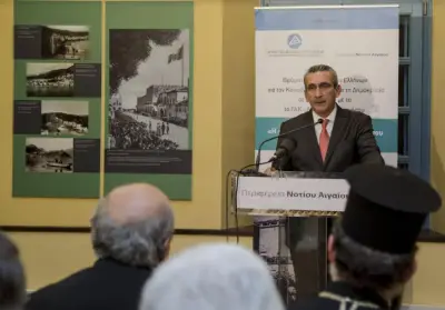 Ο Περιφερειάρχης Νοτίου Αιγαίου, στην ομιλία του τόνισε μεταξύ άλλων: «Σήμερα με τη σεμνή αυτή τελετή δεν τιμούμε με την παρουσία μας εδώ μόνο όλους όσους έπεσαν μαχόμενοι στον πόλεμο, αλλά αποτίουμε σεμνά φόρο τιμής σ’ εκείνους που πολέμησαν σκληρά με όπλα την πολιτική και τη διπλωματία. Κι αυτό αποτελεί αξιωματική αλήθεια. Περιδιαβαίνοντας στους χώρους του Ελληνικού Προξενείου κυριευόμαστε από το ρίγος της ιστορίας του. Αναβαπτιζόμαστε στην ίδια την ιστορική μας μνήμη εδώ, στη Ρόδο, στη Δωδεκάνησο.