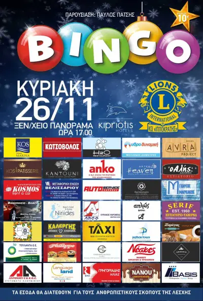 Το διασκεδαστικότερο παιχνίδι της χρονιάς το «BINGO» διοργανώνει για άλλη μια χρονιά η Λέσχη LIONS Κω «ΙΠΠΟΚΡΑΤΗΣ», την Κυριακή 26/11, στις 5μ.μ., στο ξενοδοχείο «Πανόραμα» Κυπριώτης, με παρουσιαστή τον Παύλο Πάτση.