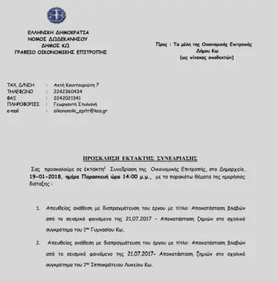 Μάλιστα από χθες (18/01) χωρίς να έχει ολοκληρωθεί έστω και αυτή η τραγελαφική διαδικασία λάβαμε πρόσκληση για έκτακτη σύγκληση της Οικονομικής Επιτροπής σήμερα (19/01) η οποία θα επικυρώσει τους «επιλεγμένους» εργολάβους χωρίς καν να γνωρίζουμε αν έχουν κατατεθεί προσφορές και αν υπάρχει το αντίστοιχο πρακτικό.