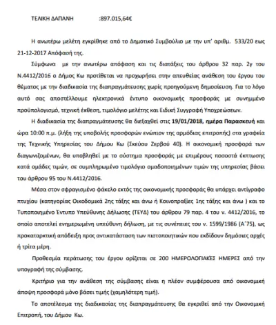 Ένα μήνα μετά δυστυχώς επιβεβαιωνόμαστε για άλλη μία φορά. Με διαδικασία φιάσκο τρεις μέρες (τυχαίο;;;) πριν εκπνεύσει η ισχύς της απόφασης για την κήρυξη έκτακτης ανάγκης στη Δημοτική Ενότητα Κω καλούνται «επιλεγμένοι» εργολάβοι να δώσουν προσφορές για έργα προϋπολογισμού 3 εκατομμυρίων ευρώ.