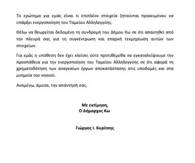 Ήδη ο Δήμαρχος Κω κ. Κυρίτσης κοινοποίησε αμέσως την απάντηση της κ. Κρέτσου στον αρμόδιο Υπουργό κ. Χαρίτση, ζητώντας άμεση ενημέρωση σχετικά με τα στοιχεία που ζητήθηκαν και δηλώνοντας ότι ο Δήμος της Κω θα παράσχει συνδρομή στην κυβέρνηση, σε ότι απαιτηθεί, για τη συγκέντρωση και επαρκή τεκμηρίωση αυτών των στοιχείων.