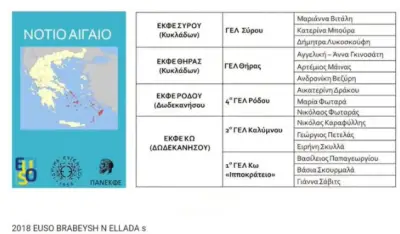Το τελευταίο Σαββατοκύριακο του Ιανουαρίου πραγματοποιήθηκε στην Αθήνα η τελική φάση του Πανελλήνιου Διαγωνισμού Φυσικών Επιστημών EUSO 2018, στην οποία συμμετείχε και η ομάδα του 1ου ΓΕΛ Κω αποτελούμενη από τους Παπαγεωργίου Βασίλη, Σάβιτς Γιάννα και Σκουρμαλλά Βάσια.