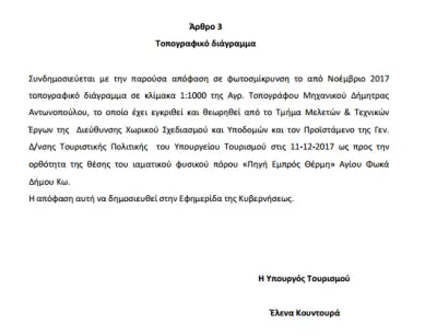 Αναγκαζόμαστε να δώσουμε στη δημοσιότητα την απόφαση της Υπουργού Τουρισμού κ.Κουντουρά που αναρτήθηκε στο Διαύγεια για την αναγνώριση του φυσικού πόρου στα Θερμά Αγίου Φωκά ως ιαματικού πόρου.