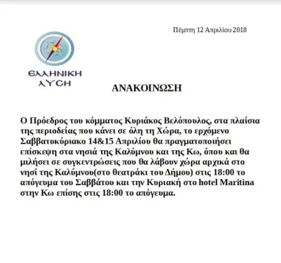 Ο Πρόεδρος του κόμματος Κυριάκος Βελόπουλος, στα πλαίσια της περιοδείας που κάνει σε όλη τη Χώρα, το ερχόμενο Σαββατοκύριακο 14&15 Απριλίου θα πραγματοποιήσει επίσκεψη στα νησιά της Καλύμνου και της Κω, όπου και θα μιλήσει σε συγκεντρώσεις που θα λάβουν χώρα αρχικά στο νησί της Καλύμνου(στο θεατράκι του Δήμου) στις 18:00 το απόγευμα του Σαββάτου και την Κυριακή στο hotel Maritina στην Κω επίσης στις 18:00 το απόγευμα.