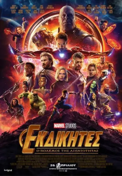 «Εκδικητές: OΠόλεμος της Αιωνιότητας» των Άνθονι & Τζόι Ρούσο με τους Ρόμπερτ Ντάουνι Τζούνιορ, Κρις Έβανς, Κρις Χέμσγουορθ, Σκάρλετ Τζοχάνσον, Μαρκ Ράφαλο, Άντονι Μακί, Τζέρεμι Ρένερ, Ελίζαμπεθ Όλσεν, Πολ Μπέτανι, Κρις Πρατ, Μπένεντικτ Κάμπερμπατς, Τομ Χόλαντ, Τσάντγουικ Μπόουζμαν, Τζος Μπρόλιν, Ντον Τσιντλ, Σεμπάστιαν Σταν, Γκουίνεθ Πάλτροου, Ζόε Σαλντάνα, Ντέιβ Μπατίστα, Κάρεν Γκίλαν, Πομ Κλεμεντιέφ, Τομ Χίντλστον, Μπενίσιο ντελ Τόρο, Ίντρις Έλμπα, Τζον Φαβρό, Γουίλιαμ Χερτ, Μπενεντίκτ Γουόνγκ, Λίντα Καρντελίνι, Ντανάι Γκουρίρα, Φλόρενς Κασούμπα, Πίτερ Ντίνκλατζ, Μπράντλεϊ Κούπερ, Βιν Ντίζελ
