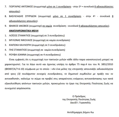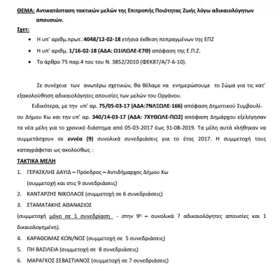 Σταματάκης Θάνος, Γιωργράς Αντώνης, Βασιλειάδης Σπύρος και Φάκκος Ιάκωβος τα μέλη της επιτροπής ποιότητας ζωής του Δήμου Κω με τις περισσότερες αδικαιολόγητες απουσίες.Οι πρώτοι τρείς έχουν συμμετάσχει μόνο σε 1 συνεδρίαση από τις 9, ενώ ο κ. Φάκκος σε καμία.