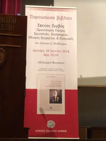 Mε μεγάλη επιτυχία, παρουσία πλήθους κόσμου, πραγματοποιήθηκε η εκδήλωση του Ιατρικού Συλλόγου Αθηνών, για την παρουσίαση του βιβλίου του Λάζαρου Ε. Βλαδίμηρου «Σκεύος Ζερβός Πρωτοπόρος Γιατρός, Ερευνητής Συγγραφέας, Εθνικός Ευεργέτης & Πολιτικός», η οποία έλαβε χώρα στο αμφιθέατρο «Ιωάννης Καποδίστριας» του Πολεμικού Μουσείου της Αθήνας, τη Δευτέρα 18 Ιουνίου 2018. Ο ΙΣΑ πήρε την πρωτοβουλία για την αξιόλογη αυτή έκδοση με στόχο να τιμήσει την εμβληματική προσωπικότητα του Σκεύου Ζερβού έναν κορυφαίο επιστήμονα και εθνικό αγωνιστή που υπηρέτησε την πατρίδα και την ιατρική επιστήμη, με συνέπεια και αυταπάρνηση. Στο πλαίσιο της εκδήλωσης απονεμήθηκαν τιμητικές διακρίσεις, σε διακεκριμένους επιστήμονες και εκπροσώπους φορέων της Δωδεκανήσου. Η βραδιά άνοιξε με την παρουσία χορωδών της Ομοσπονδίας Δωδεκανησιακών Συλλόγων Αττικής και το καλωσόρισμα του προέδρου του ΙΣΑ κ. Γιώργου Πατούλη, ο οποίος μεταξύ άλλων ανέφερε τα εξής: «Ο Ιατρικός Σύλλογος με αυτή την έκδοση θέλει να αναδείξει και να υπενθυμίσει το φωτισμένο μονοπάτι της ηθικής και της ανιδιοτελούς προσφοράς. Στις σημερινές δύσκολες συγκυρίες που περνάει η πατρίδα μας, πιστεύουμε ότι έχει ιδιαίτερη αξία να προβάλλουμε και να τιμούμε τις προσωπικότητες που με το έργο τους υπηρέτησαν τα υψηλά ιδεώδη. Ο Ιατρικός Σύλλογος Αθηνών στο πρόσωπο του Σκεύου Ζερβού τιμά κάθε Έλληνα γιατρό που αγωνίστηκε με αυταπάρνηση, για την πατρίδα και την επιστήμη και άφησε το λαμπρό παράδειγμά του ως παρακαταθήκη στις επόμενες γενεές». Ο πρόεδρος του ΙΣΑ χαρακτήρισε την εκδήλωση «κορυφαίου συμβολισμού», για αυτή την τόσο πληγωμένη εθνικά χρονική στιγμή. «Ο Σκεύος Ζερβός είναι παράδειγμα τόσο επίκαιρο για τις ημέρες που ζούμε σήμερα, όπου περιφρονούν τους εθνικούς μας αγώνες για την ελληνικότητα της πατρίδας μας, των σημερινών και αυριανών γενεών», ανέφερε χαρακτηριστικά. Η εκδήλωση άνοιξε με τη βράβευση της παθολόγου κυρίας Ελευθερίας Κρικέλη, για τη έργο της και τη συμβολή της στη διάδοση της ιδέας της δωρεάς οργάνων στη χώρα μας. Ακολούθησε η βράβευση του κ. Δημήτρη Κρεμαστινού, Αντιπροέδρου της Βουλής, πρώην υπουργού Υγείας και ομότιμου Καθηγητή Καρδιολογίας, του κ. Κωνσταντίνου Κωνσταντινίδη, Καθηγητή Χειρουργικής Ohio State University των ΗΠΑ, - του οποίου την τιμητική πλακέτα έλαβε ο γιος του Κωνσταντίνος Κωνσταντινίδης λόγω ανειλημμένων υποχρεώσεων- . Επίσης βραβεύτηκαν για το έργο τους ο κ.κ. .Μιχάλης Κουτούζης, Επεμβατικός Καρδιολόγος, Ιωάννης Φραγκούλης, Πρόεδρος της Ομοσπονδίας Δωδεκανησιακών Συλλόγων καθώς και η κυρία Κατερίνα Γιαννάτου, Οδοντίατρος και μέλος της Νεολαίας του Δωδεκανησιακού Αγώνα κατά τη δεκαετία 1940. Στη συνέχεια, παρουσιάστηκε το βιβλίο του Λάζαρου Ε. Βλαδίμηρου. Οι ομιλητές τόνισαν την πρωτοπόρα δράση του Σκεύου Ζερβού για χάρη της πατρίδας και της ιατρικής καθώς και την εξαιρετική δουλειά του συγγραφέα. Στη συζήτηση που συντόνισε ο κ. Αριστείδης Διαμαντής, Ιατρός, Πλοίαρχος του Πολεμικού Ναυτικού και Ιστορικός της Ιατρικής συμμετείχαν οι κ.κ Γιώργος Ανδρούτσος, Ομότιμος Καθηγητής Ιστορίας της Ιατρικής ΕΚΠΑ, Πάνος Αποστολίδης, Ιατρός, Συγγραφέας και Ιωάννης Μπράμης, Ομότιμος Καθηγητής Χειρουργικής ΕΚΠΑ. Χαιρετισμό απηύθυνε ο συγγραφέας του βιβλίου κ. Λάζαρος Βλαδίμηρος. Ο γιατρός και Ιστορικός της Ιατρικής τόνισε ότι ένας τόσο σπουδαίος άνθρωπος και επιστήμον