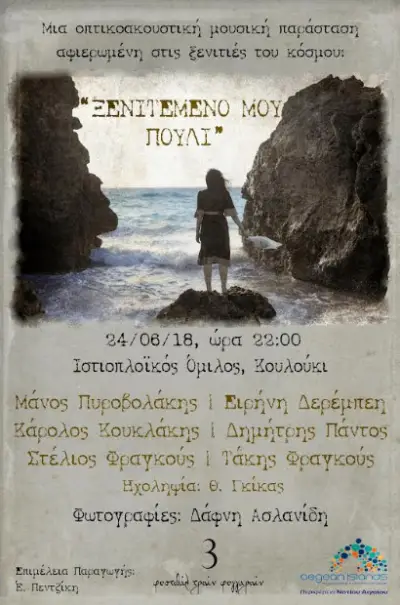 Η πρώτη εκδήλωση που θα πραγματοποιηθεί την Κυριακή 24 Ιουνίου 2018 στις 22:00 στον Ιστιοπλοϊκό Όμιλο ‘Κουλούκι’ αφορά μία οπτικο – ακουστική μουσική παράσταση, με τίτλο «Ξενιτεμένο μου πουλί» αφιερωμένη στις ξενιτιές του κόσμου με τους: Μάνο Πυροβολάκη, Ειρήνη Δερέμπεη, Κάρολο Κουκλάκη, Δημήτρη Πάντο, Στέλιο Φραγκούς, Τάκη Φραγκούς.