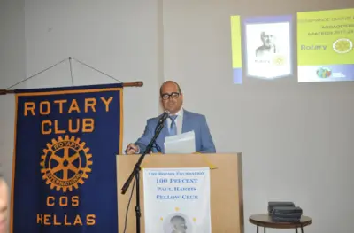Ο απερχόμενος πρόεδρος κ. Γιώργος Μαστρογιώργης, αφού έκανε απολογισμό των δράσεων, αναφέρθηκε στις σημαντικές πανελλαδικές διακρίσεις του Ροταριανού Ομίλου Κω για την χρονιά που πέρασε, βράβευσε κάποια από τα μέλη του ομίλου για την ιδιαίτερη προσφορά τους και παρέδωσε την σκυτάλη στον νέο πρόεδρο κ. Τσαμπίκο Καματερό.