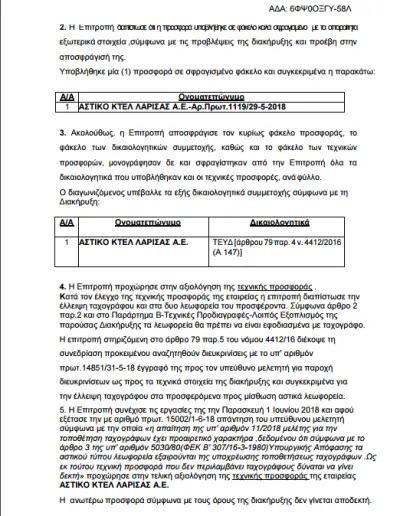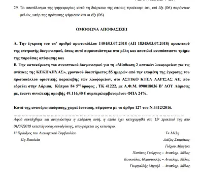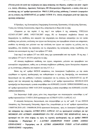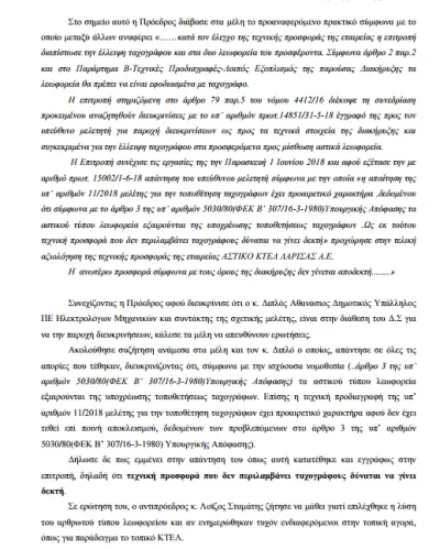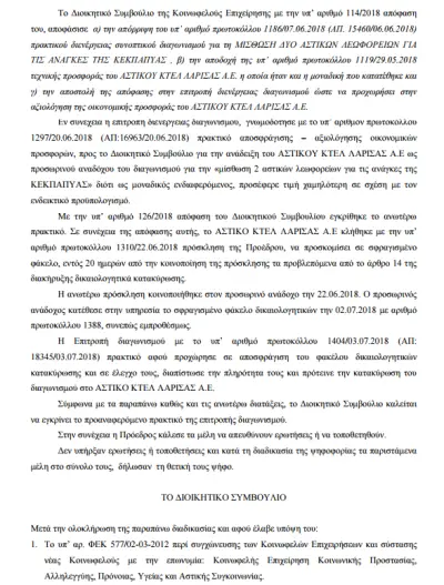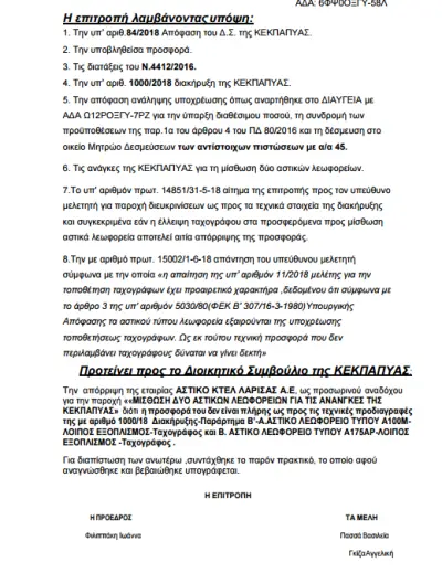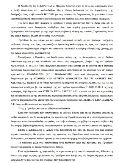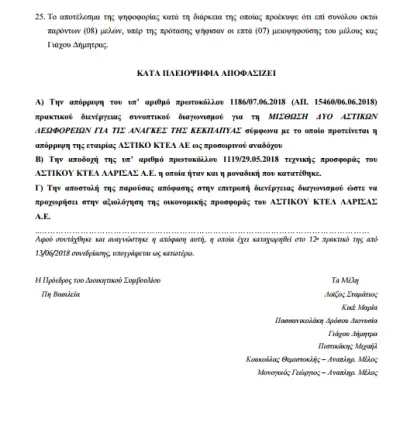 Η επιτροπή διενέργειας διαγωνισμού, γνωμοδότησε με το υπ’ αριθμόν πρωτοκόλλου 15460/06.06.2018 πρακτικό διενέργειας προς το Διοικητικό Συμβούλιο για την απόρριψη της εταιρείας Αστικό ΚΤΕΛ Λάρισας Α.Ε διότι η προσφορά του δεν ήταν πλήρης ως προς τις τεχνικές προδιαγραφές της με αριθμό 1000/18 Διακήρυξης – Παράρτημα Β.
