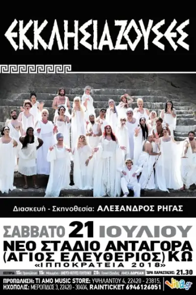 Οι Εκκλησιάζουσες το καλοκαίρι του 2018, έρχονται κατευθείαν από την Αρχαία Αθήνα του 400π.Χ. με τη μοναδική διαφορά ότι είναι διανθισμένες με μουσικές από όλη την Ελλάδα. Από τα δημοτικά τραγούδια και Βυζαντινούς ύμνους έως διασκευές στον πυρρίχιο, στο πεντοζάλι, σε Κερκυραϊκά τραγούδια, σε νησιωτικούς ρυθμούς και σε βαλκανικά τέμπο.