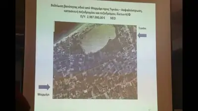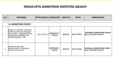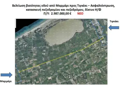 στ) στοιχεία από την Λαϊκή Συνέλευση της Δημοτικής Κοινότητας Πυλίου όπου το έργο της βελτίωσης του δρόμου Μαρμάρι - Τιγκάκι παρουσιάζεται ως έργο υπό μελέτη με προϋπολογισμό 2.987.000 ευρώ.