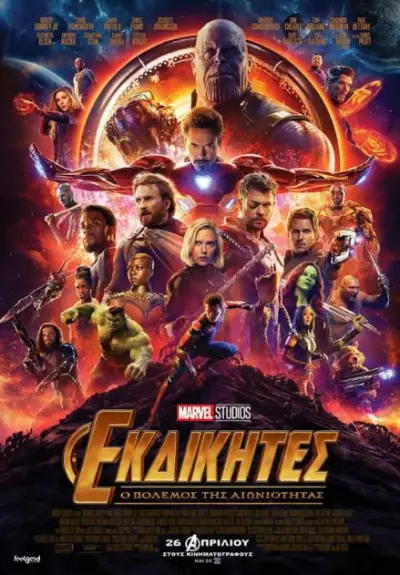 «Εκδικητές: O ΠόλεμοςτηςΑιωνιότητας» των Άνθονι & Τζόι Ρούσο με τους Ρόμπερτ Ντάουνι Τζούνιορ, Κρις Έβανς, Κρις Χέμσγουορθ, Σκάρλετ Τζοχάνσον, Μαρκ Ράφαλο, Άντονι Μακί, Τζέρεμι Ρένερ, Ελίζαμπεθ Όλσεν, Πολ Μπέτανι, Κρις Πρατ, Μπένεντικτ Κάμπερμπατς, Τομ Χόλαντ, Τσάντγουικ Μπόουζμαν, Τζος Μπρόλιν, Ντον Τσιντλ, Σεμπάστιαν Σταν, Γκουίνεθ Πάλτροου, Ζόε Σαλντάνα, Ντέιβ Μπατίστα, Κάρεν Γκίλαν, Πομ Κλεμεντιέφ, Τομ Χίντλστον, Μπενίσιο ντελ Τόρο, Ίντρις Έλμπα, Τζον Φαβρό, Γουίλιαμ Χερτ, Μπενεντίκτ Γουόνγκ, Λίντα Καρντελίνι, Ντανάι Γκουρίρα, Φλόρενς Κασούμπα, Πίτερ Ντίνκλατζ, Μπράντλεϊ Κούπερ, Βιν Ντίζελ