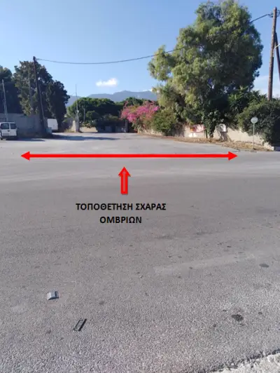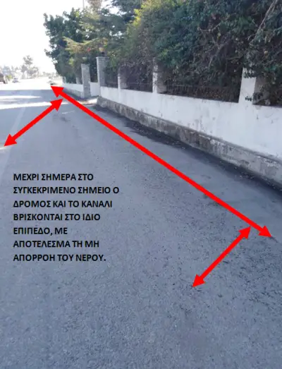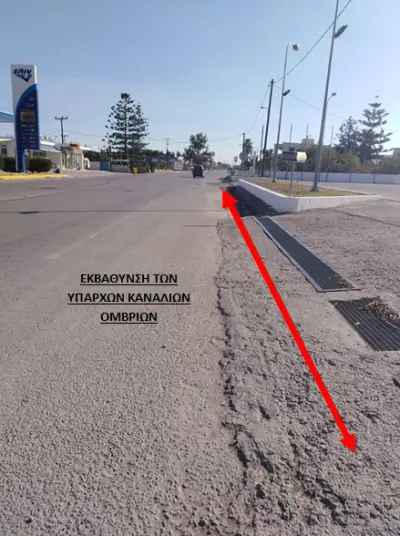 1) Ξεκινώντας από την είσοδο του σημερινού εργοταξίου του Δήμου και τον δρόμο πρώην σφαγεία τα νερά κατεβαίνουν ως «χείμαρρος» δυστυχώς στο συγκεκριμένο σημείο δεν υπάρχει κανάλι με σχάρα για να απορροφούνται τα νερά έτσι ώστε να μην καταλήγουν ένα μεγάλο μέρος τους που σήμερα καταλήγει στη μέση του δρόμου και κατεύθυνση προς χωριά στη μέση του δρόμου .
