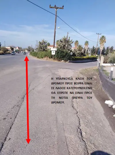 2) κατευθυνόμενος κάποιος από Κω προς χωριά και ποιο συγκεκριμένα αμέσως μετά από την είσοδο του εργοταξίου εκεί που ο δρόμος ξεκινάει σε μια ευθεία ο δρόμοςε ως τον Σκλαβενίτη η δεξιά πλευρά διαπιστώνεις ότι η κλήση του δρόμου είναι προς τον βορά προς θάλασσα ενώ το κανάλι που είναι αριστερά για την απορροή των νερών είναι σε ακριβώς αντίθετη κλήση … εδώ λοιπόν χρειάζεται ένας τάπητας σε όλη την ευθεία του δρόμου και η κλήση του δρόμου θα πρέπει να είναι προς νοτιά δηλαδή από απο βορρά προς νότο έτσι ώστε τα νερά να συγκεντρώνονται στο κανάλι με μια φυσική ροη καθώς σήμερα δεν υπάρχει η σωστή κλήση.