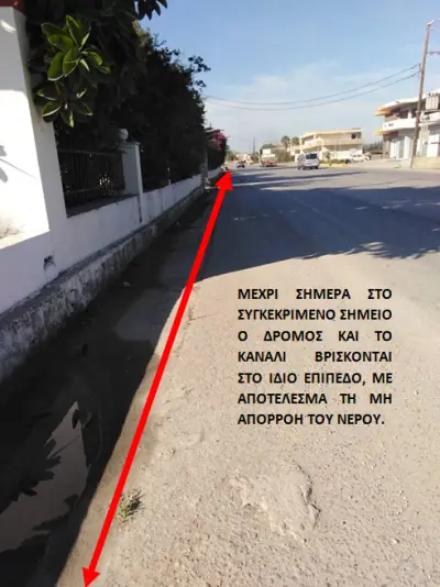 4) Το κανάλι που βρίσκεται στην δεξιά πλευρά κατεβαίνοντας από χωριά προς Κω θα έπρεπε στο σημείο εκείνο να έχει βάθος τουλάχιστον 5 μέτρα και ψηλά από το Εργοτάξιο να ξεκινάει από ένα βάθος Α και καταλήγοντας στο ύψος του Φιλίνου θα έπρεπε να είναι τουλάχιστον 5 μέτρα στο μεγαλύτερο μέρος από το ΕΚΟ βενζινάδικο ως τέρμα τουλάχιστον με ένα βάθος 4 και 5 μέτρων, ταυτόχρονα οι ράμπες εισόδου στα καταστήματα οι τσιμεντένιες θα έπρεπε να ήταν με μεγάλα τούμπα τσιμέντου και όχι όπως τα σημερινά με ένα σωλήνα φ200…. δηλ. το υπάρχων κανάλι ομβρίων χρειάζεται ολική αποκατάσταση για την σωστή λειτουργία.