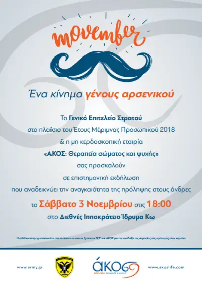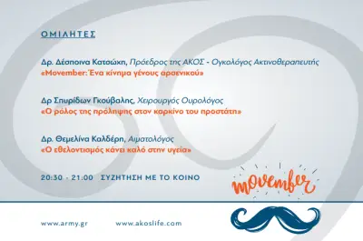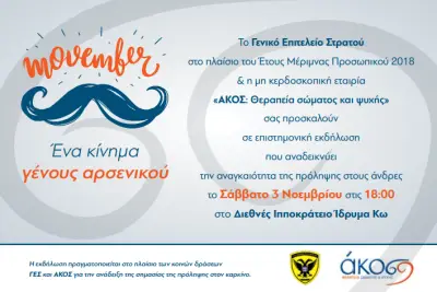 Το Γενικό Επιτελείο Στρατού και η ΑΚΟΣ γιορτάζουν τον Movember με μία επιστημονική εκδήλωση με την οποία καλούν τους άνδρες να θέσουν ως προτεραιότητα την προάσπιση της υγείας τους, εγκαταλείποντας τις βλαβερές συνήθειες και υιοθετώντας έναν υγιεινό και ισορροπημένο τρόπο ζωής.