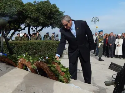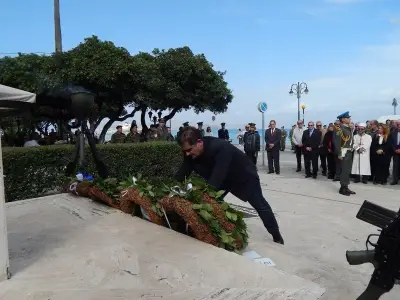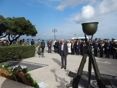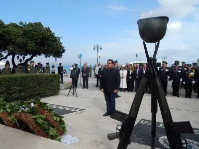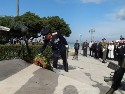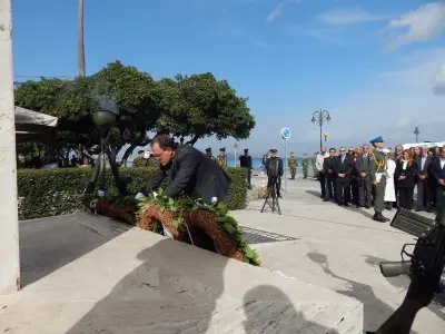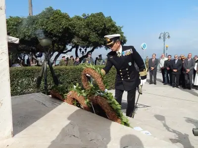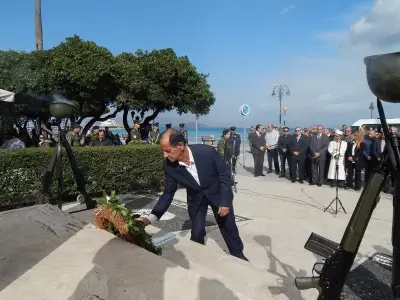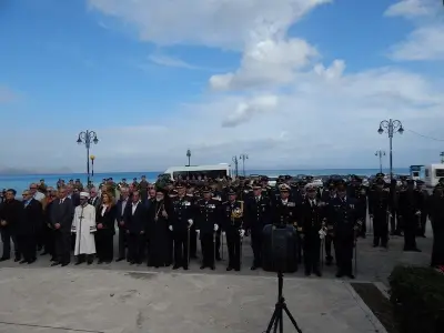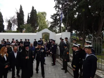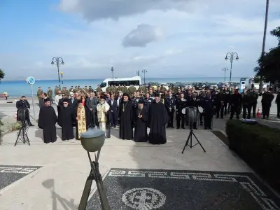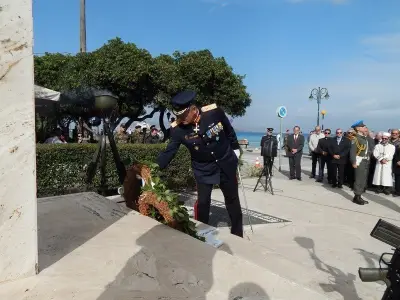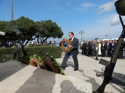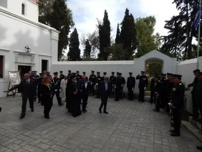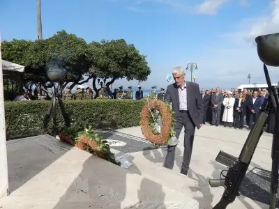 Αμέσως μετά ακολούθησε επιμνημόσυνη Δέηση και κατάθεση στεφάνων στο Μνημείο Ηρώων ενός λεπτού σιγή και ανάκρουση του Εθνικού Ύμνου.