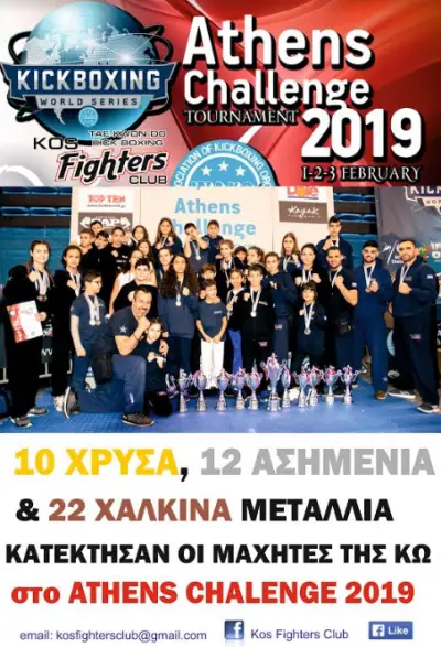Την Παρασκευή 1-2-3 Φεβρουαρίου πραγματοποιήθηκε το διεθνές πρωτάθλημα Athens Challenge, υπό την αιγίδα της Παγκόσμιας Ομοσπονδίας WAKO και της Ελληνικής Ομοσπονδίας Kick Boxing. Το πρωτάθλημα ξεπέρασε τις 2.500 συμμετοχές, μεταξύ των οποίων 15 αποστολές από το εξωτερικό, κάτι που επιβεβαιώνει γιατί θεωρείται η μεγαλύτερη διοργάνωση Kick Boxing που διεξάγεται στην Ελλάδα και μία από τις 5 κορυφαίες διοργανώσεις σε όλη την Ευρώπη.