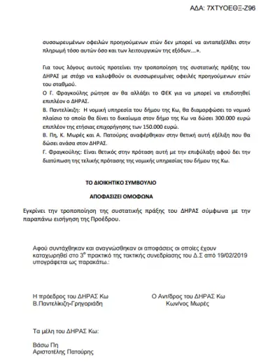Τεχνηέντως παρέσυραν τότε το Δημοτικό Συμβούλιο σε μία απόφαση αλλαγής και του αριθμού των μελών του Διοικητικού Συμβουλίου από πέντε σε επτά (ποιο πολλά είναι τα μέλη του Διοικητικού Συμβουλίου από τους εργαζόμενους 1η ΠΑΓΚΟΣΜΙΑ ΠΡΩΤΟΤΥΠΙΑ) επίσης αλλάζει το άρθρο ΠΟΡΟΙ και από έως 600.000 ευρώ δυνητικά που ήταν η επιχορήγηση του Δήμου προς τον ΔΗΡΑΣ, γίνεται 150.000 ευρώ, ενώ η μισθοδοσία των εργαζομένων ήταν 320.00 ευρώ περίπου. 2η ΠΑΓΚΟΣΜΙΑ ΠΡΩΤΟΤΥΠΙΑ.