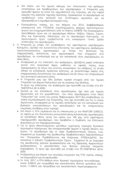 Επιπρόσθετα, το έργο της επέκτασης αεροδιαδρόμου στο αεροδρόμιο της Καλύμνου δεν προχώρησε, παρά το γεγονός ότι είχε συσταθεί ομάδα εργασίας από συναρμόδιες Διευθύνσεις της ΥΠΑ, το πόρισμα της οποίας αγνοείται.