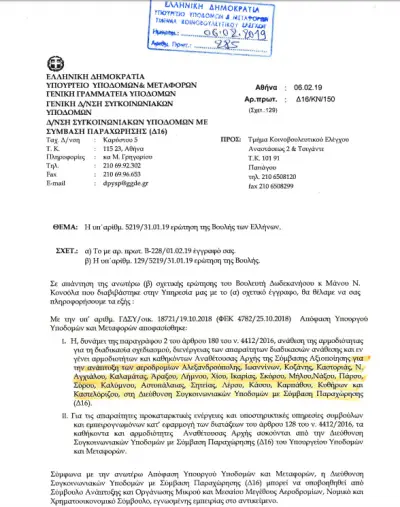 Σύμφωνα με απάντηση του Υπουργείου Υποδομών και Μεταφορών στην Ερώτηση που είχε καταθέσει ο κ. Κόνσολας, προκύπτουν τα εξής: