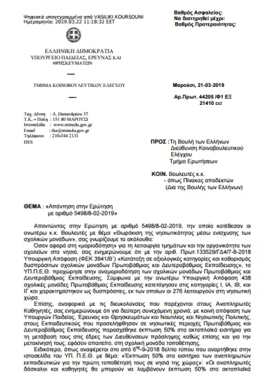 Σε σχετική ερώτηση βουλευτών του ΣΥΡΙΖΑ που υπογράφει και ο βουλευτής Δωδεκανήσου Ηλίας Καματερός αναφέρονται οι ρυθμίσεις που ενίσχυσαν τελευταία τις σχολικές μονάδες στα νησιά και γενικότερα στην παιδεία (συνημμένο).