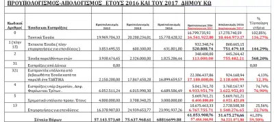 ---Ο βαθμός υλοποίησης του προϋπολογισμού 2017, με βάσει τα στοιχεια που παρουσιάζονται, είναι 52%! Δηλαδή ο πραγματικός προϋπολογισμός του μεγάλου δήμου της Κω είναι μόλις 30 εκ ευρώ.---Ο απολογισμός του 2017 δείχνει μια βελτίωση και μια προσπάθεια σε σχέση με το παρελθόν. Όμως επί της ουσίας ανακατεύει μίζερα την φτώχια μας, κοιτάζοντας να καλύψει τις λειτουργικές ανάγκες του δήμου οι οποίες βαίνουν συνεχώς μειούμενες με ότι αυτό συνεπάγεται! Από την άλλη αποδεικνύεται ότι με την τρέχουσα λογική της διαχείρισης δεν μπορεί να δημιουργήσει αναπτυξιακό έργο! Στο δεύτερο μέρος των εξόδων φαίνεται ότι οι πληρωμές για επενδύσεις το 2017 (η καλύτερη χρονιά από πολιτική άποψη της παραγωγικότητας της δημοτικής αρχής της περιόδου 2014-2019) οι επενδύσεις ήταν μόλις το 34% των προϋπολογισθέντων! Το συνολικό ποσό επενδύσεων ήταν 4,5 εκ που όλα σχεδόν είναι συντηρήσεις υποδομών και κτηρίων! Το να αυξάνεις το αποθεματικό, το να μην διεκδικείς αυτά που σου χρωστούν, το να μην εκμεταλλεύεσαι τον δανεισμό για να χρηματοδοτήσεις την αξιοποίηση υπαρχόντων πόρων, είναι κλασσική περίπτωση διαχειριστικής και πολιτικής ανεπάρκειας! Αυτά που ο πίνακας απολογισμού-ισολογισμού μας… ‘’φωνάζει’’ είναι διαχρονικά προβλήματα και αποτελούν αποδεικτικά στοιχεια για αλλαγή πολιτικής! Αλλιώς, δικαιολογημένα έχουμε φτάσει να θεωρούμε την δημοτική μιζέρια πρόοδο και κάποιο μικροέργο που γίνεται ως ‘’επίτευγμα’’!
