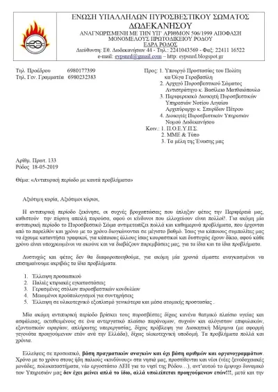 Ένωση Υπαλλήλων Πυροσβεστικού Σώματος Δωδεκανήσου : Αντιπυρική περίοδος με καυτά προβλήματα
