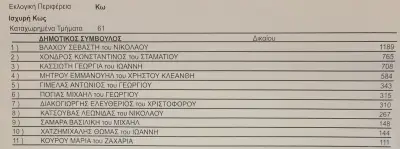 Για τον συνδυασμό της Ισχυρής Κω η κατανομή των εδρών έγινε ως εξής: