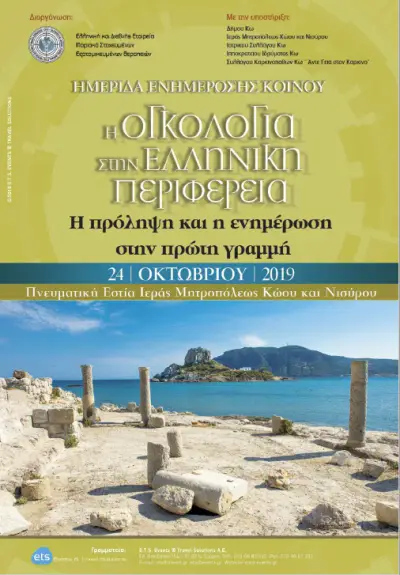 Η Ελληνική και Διεθνής Εταιρεία Μοριακά στοχευμένων εξατομικευμένων θεραπειών, σε συνεργασία με τον Ιατρικό Σύλλογο Κω, διοργανώνουν Ογκολογική Ημερίδα Ενημέρωσης κοινού με τίτλο: "Η ΠΡΟΛΗΨΗ ΚΑΙ Η ΕΝΗΜΕΡΩΣΗ ΣΩΖΟΥΝ ΖΩΕΣ" την Πέμπτη 24 Οκτωβρίου 2019 και ώρες 15:30 με 20:00 στην Πνευματική Εστία της Ιεράς Μητροπόλεως Κώου και Νισύρου. στην Κω. Η εκδήλωση πραγματοποιείται με την ευγενική υποστήριξη: