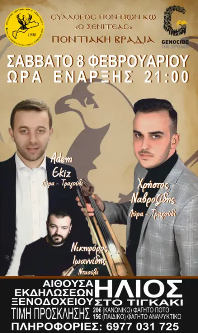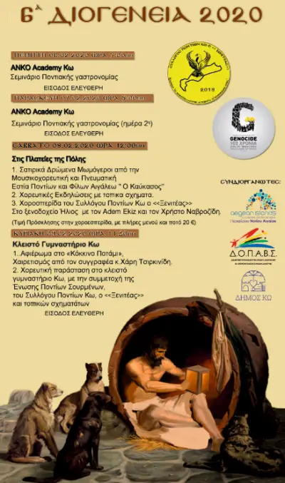 Ο Σύλλογος Ποντίων Κω «Ξενιτέας» συμπληρώνοντας 30 χρόνια από την ίδρυσή του και συνεχίζοντας την προσφορά στα πολιτιστικά δρώμενα του τόπου μας, διοργανώνει τα ''ΔΙΟΓΕΝΕΙΑ 2020'', από τις 6 έως τις 9 Φεβρουαρίου του 2019.