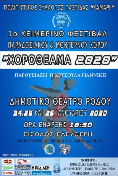 Η χορευτική ομάδα του συλλόγου μας είχε την χαρά να συμμετάσχει, μετά από πρόσκληση των διοργανωτών, στο 1ο χειμερινό φεστιβάλ παραδοσιακού & μοντέρνου χορού, που πραγματοποιήθηκε στις 24-26/1/2020 στη Ρόδο. Σε ένα γεμάτο χορό & μουσική 3ήμερο 9 σύλλογοι της περιοχής μας αλλά και από την Β. Ελλάδα, παρουσίασαν την περιοχή τους ή τον τόπο καταγωγής τους στο Δημοτικό Θέατρο Ρόδου.