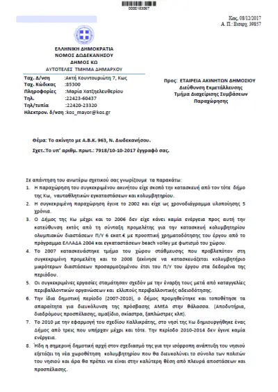 Θέμα: Το ακίνητο με Α.Β.Κ. 963, Ν. Δωδεκανήσου. Σχετ.:Το υπ’ αριθμ. πρωτ.: 7918/10-10-2017 έγγραφό σας.