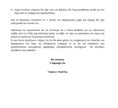 Αντί να διεκδικήσει, ως όφειλε, να παραμείνει η παραλία στην ευθύνη του Δήμου έπραξε τα αντίθετα. Παρότρυνε να εκποιηθεί σε ιδιώτη και να γίνει ξενοδοχείο 14000τ.μ .