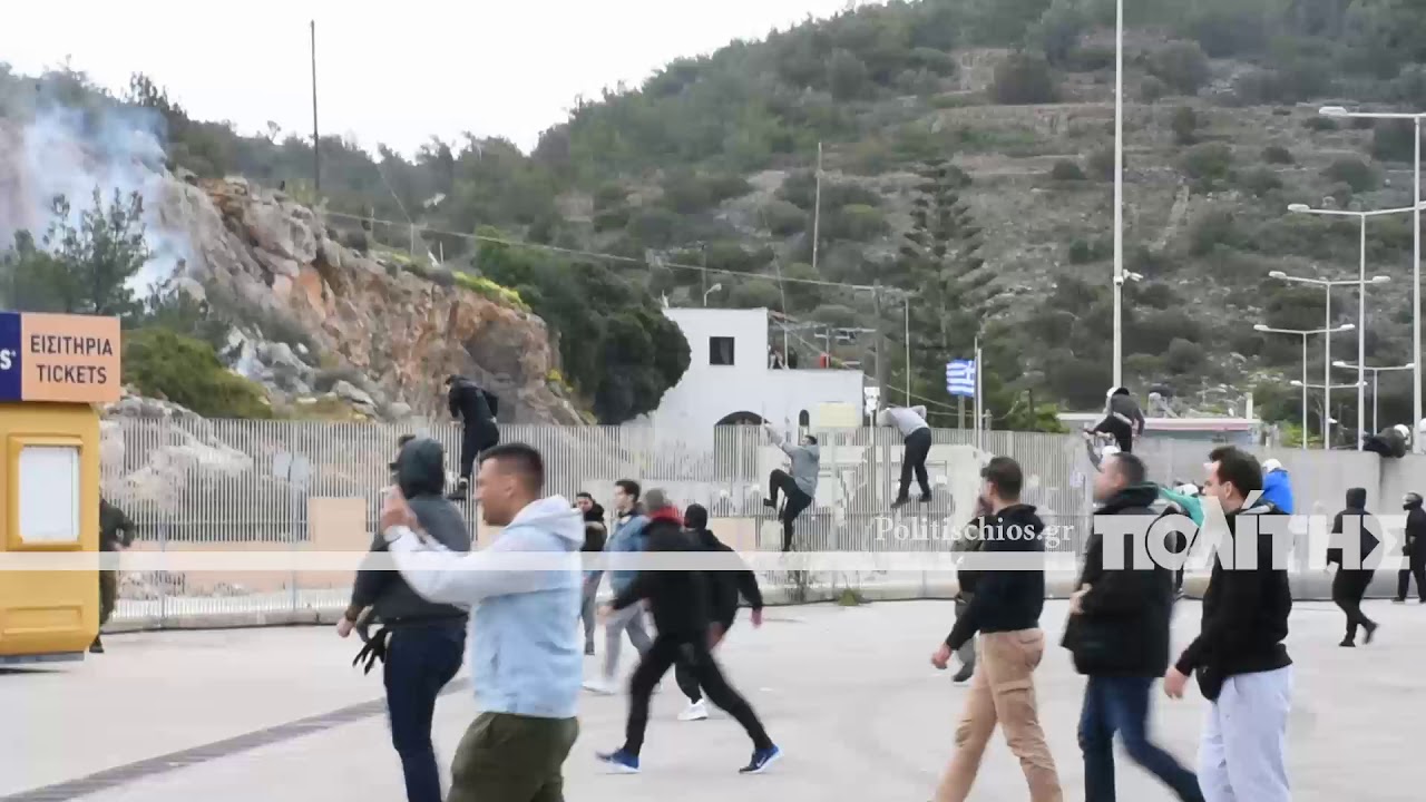 Λίγο πριν την επιβίβασή τους στο πλοίο «Νήσος Ρόδος», οι δυνάμεις των ΜΑΤ έδωσαν την τελευταία τους παράσταση, κινούμενοι εναντίον ομάδας 15 ατόμων που είχαν συγκεντρωθεί έξω από τον λιμένα Μεστών και σε απόσταση ασφαλείας.