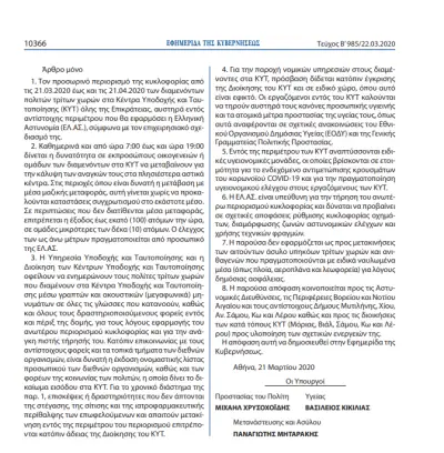 1. Τον προσωρινό περιορισμό της κυκλοφορίας από τις 21.03.2020 έως και τις 21.04.2020 των διαμενόντων πολιτών τρίτων χωρών στα Κέντρα Υποδοχής και Ταυτοποίησης (ΚΥΤ) όλης της Επικράτειας, αυστηρά εντός αντίστοιχης περιμέτρου που θα εφαρμόσει η Ελληνική Αστυνομία (ΕΛ.ΑΣ.), σύμφωνα με τον επιχειρησιακό σχεδιασμό της.