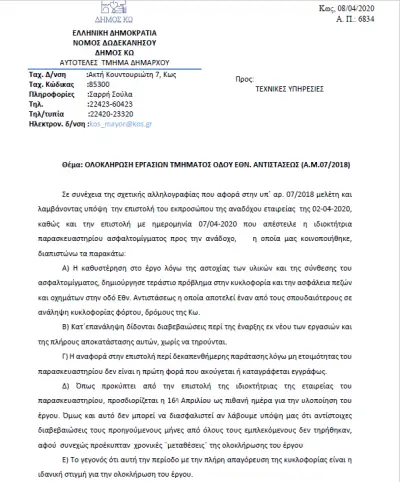 Για αυτό το λόγο, με επιστολή που απέστειλε στον επιβλέποντα του έργου και για εξαιρετικούς λόγους προστασίας του δημοσίου συμφέροντος προ του αδιεξόδου που δημιουργήθηκε, αναγκάστηκε ο Δήμαρχος να ζητήσει να διατεθούν για 2 ημέρες οι εγκαταστάσεις του Δήμου μας που δεν παράγουν τώρα ασφαλτόμιγμα, όπου ο εργολάβος με αποκλειστικά δικά του όλα τα υλικά, να αναμείξει το ασφαλτόμιγμα για να ολοκληρώσει το έργο της Εθνικής Αντιστάσεως.