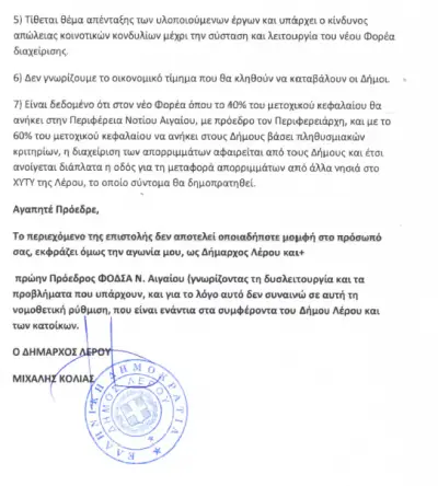 Η επιστολή του Δημάρχου Λέρου κ. Μιχάλη Κόλια προς τον Πρόεδρο της ΠΕΔ Νοτίου Αιγαίου κ. Αντώνη Καμπουράκη