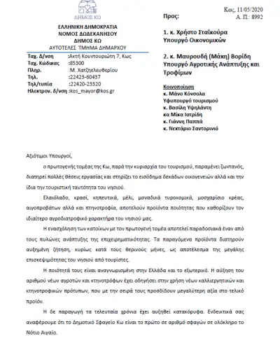 Ο Δήμαρχος Κω τονίζει στην επιστολή του, την οποία κοινοποιεί και στους βουλευτές Δωδεκανήσου, ότι «… σήμερα, όσο ποτέ, η στήριξη και ανάπτυξη του πρωτογενή τομέα αποτελεί όρο επιβίωσης της χώρας μας. Είναι ένα από τα στοιχήματα που πρέπει να κερδίσουμε, με σχέδιο και οργάνωση.»