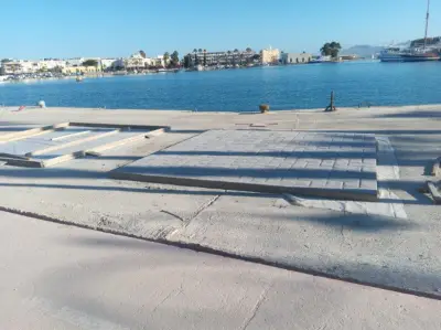 (σχόλιο φωτογραφίας λιμανιού Μαρμαρίδος: δάπεδα συνδυασμός λευκού μαρμάρου και μαύρου και κόκκινου γρανίτη, Φωτιστικά inox με φωτοβολταική υποστήριξη, pillars ηλεκτρονικά σε καλαίσθητα προστατευτικά ξύλινα κιβώτια iroko, ακόμη και τα καλαθάκια των σκουπιδιών έχουν επικάλυψη περιμητρικά με πράσινο πλαστικό προσομοίωνα κισσού που πρέπει να το ψηλαφίσεις για να καταλάβεις την πλαστική υφή του κλπ).
